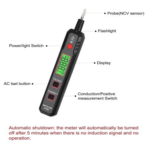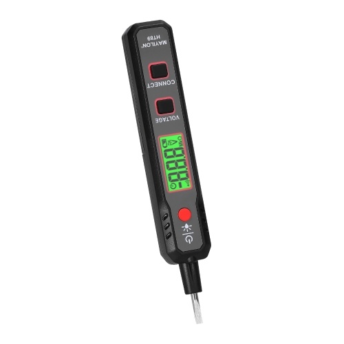 This inductive intelligent electric test pen is a multifunction design, that supports alternating current voltage detection, on/off detection, breakpoint detection, battery positive detection, and intelligent identification of zerolines/live lines function. Digital display with green and red dual backlight colors, and with intelligent sound and light alarm function. The meter will automatically be turned off after 5 minutes when there is no induction signal and no operation. This test pen has a flashlight, perfect for working in a dark area, and easy observation of the environment at night.
