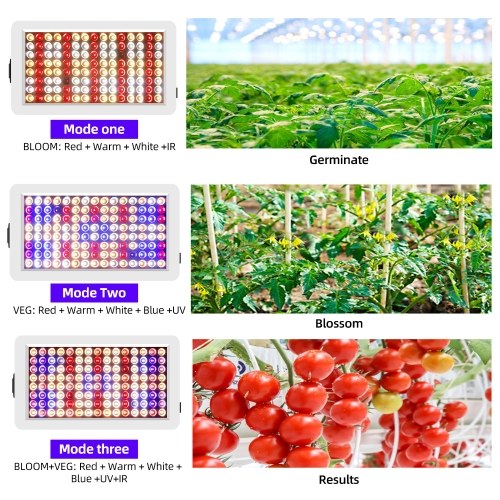 Mode: 30-35W 2663lm VEG (red light + warm light + white light + blue light + UV), 30-35W 2747lm BLOOM (red light + warm light + white light + IR), 65-70W 5346lm VEG + BLOOM (red light + warm light + white light + blue light + UV + IR)