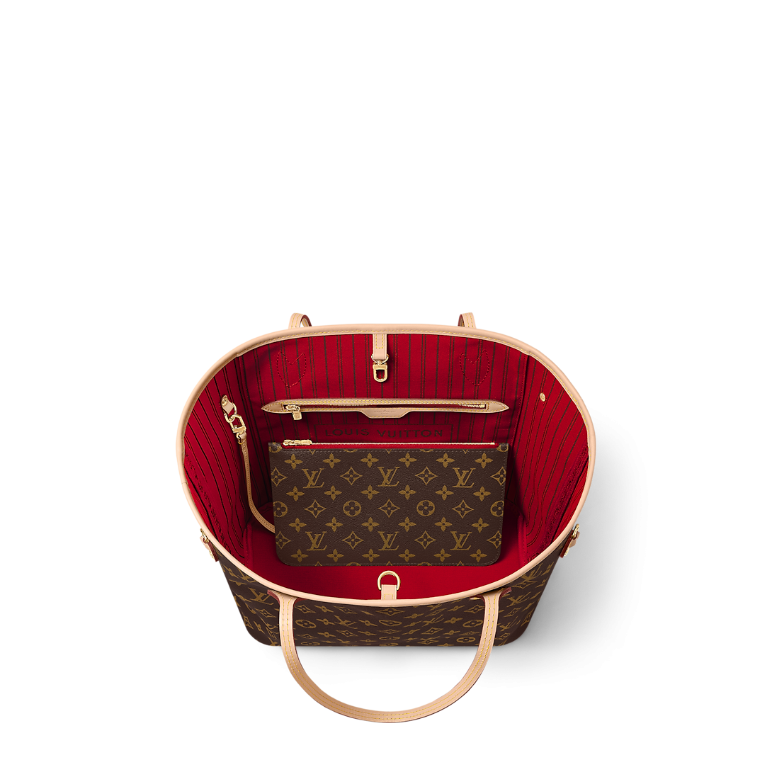 The Neverfull MM tote unites timeless design with heritage details. Made from supple Monogram canvas with natural cowhide trim, it is roomy yet not bulky, with side laces that cinch for a sleek allure or loosen for a casual look. Slim, comfortable handles slip easily over the shoulder or arm. Lined in colorful textile, it features a removable pouch which can be used as a clutch or an extra pocket.