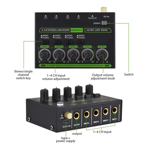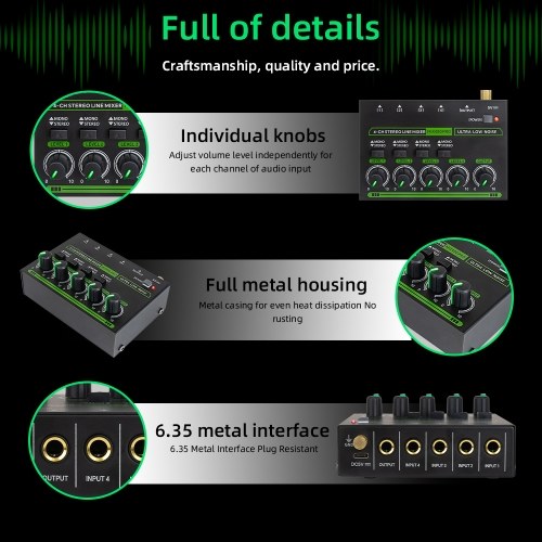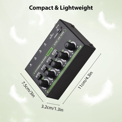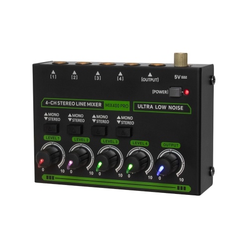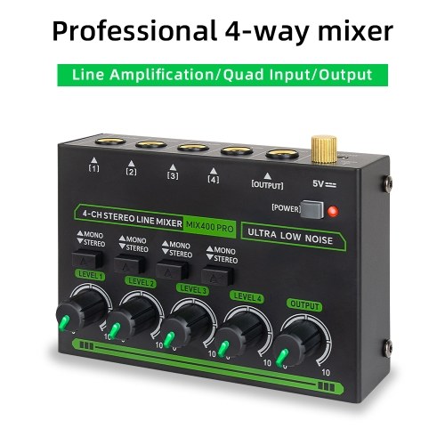 【Ultra-Low Noise】: This mini audio mixer delivers the highest sound quality at all output levels, boasting ultra-low noise operability for outstanding audio performance. It's perfect for quick mixing of 4 line level signals without any complications. Even at the highest levels, this 4-channel mixer maintains the highest signal quality and integrity, making it an ideal choice for multi-keyboard rigs and recording.