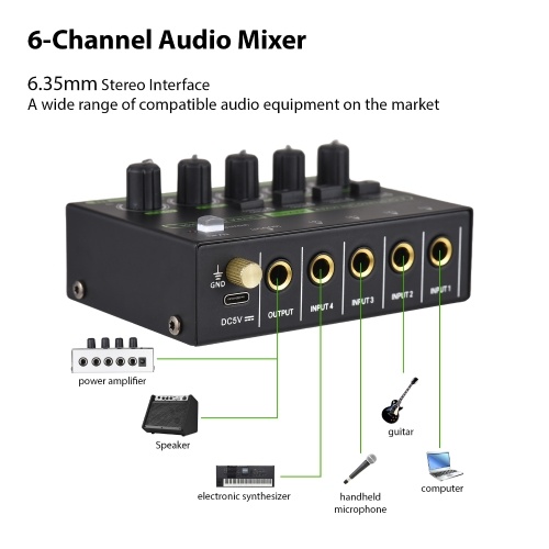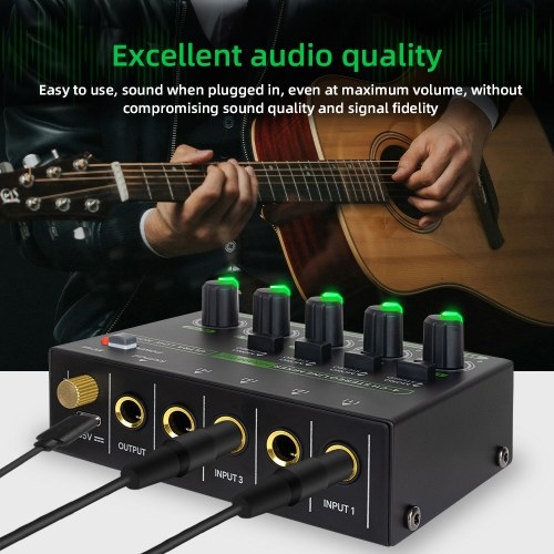 【Multi-Functional and Simple Control】: This mixer collects sounds from many different sources (guitar, bass, and keyboard) to a listening position for monitoring or routing. Each channel on the linear mixer has an independent volume control, independent input plug and volume control, and a single output for the amplifier. It mixes multiple channels into one track, making it suitable for your keyboard, small stage setup, drum kit, or sub-mixing.