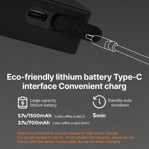 Rechargeable: The rechargeable coffee scale built-in 700mAh(Mini scale) /1500mAh(Standard scale) battery and silicone-protected charging port,which is more eco-friendly and convenient. No need to worry about purchasing batteries.To extend the lifespan of the pocket scale,it is recommended to use a 5V,1A/2A adapter for charging.And it is recommended to use the original charging cable for charging.