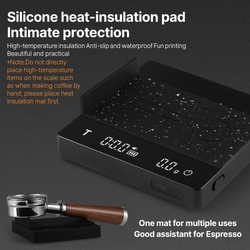Premium Material and User Friendly Design: The scale for coffee is made of durable aluminum alloy and stainless steel.Multifunctional silicone insulation cover is high temperature insulation, waterproof and anti-slip. When inverted, the heat pad can be used to support coffee portafilter.In addition,there is a mute function, auto shut-off,LED display,and non-slip pad on the bottom.