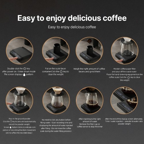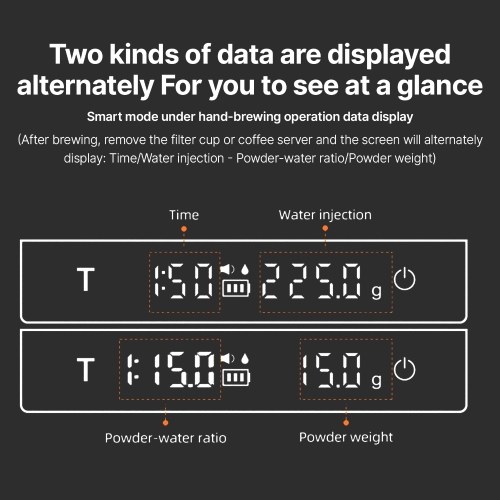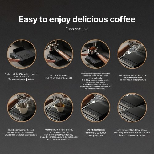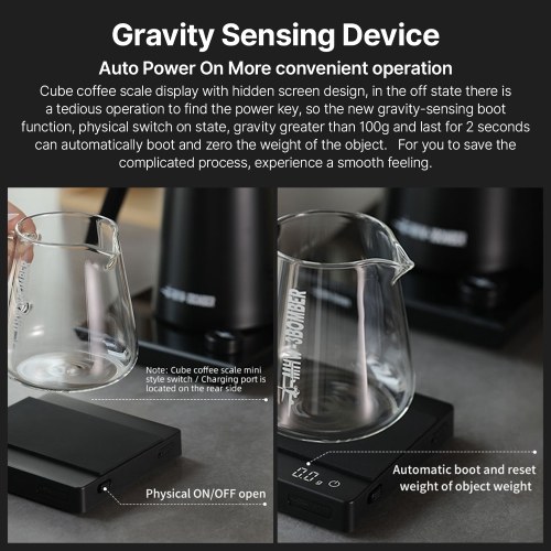 Gravity Sensing Function:When the espresso weight scale is in standby with the physical switch turned on,placing products weighing over 100g on the smart coffee scale can automatically turn on and weigh the object before resetting to 0. This feature saves you the complex process of turning on and taring,making your coffee making process more efficient.