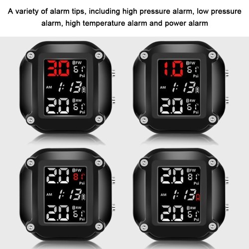 Digital display of tire temperature, tire pressure and time, real-time monitoring of tire condition, alarm flashing light in-case-of abnormality, effectively improve the service lifes of tire, increase riding safety and save energy consumption.