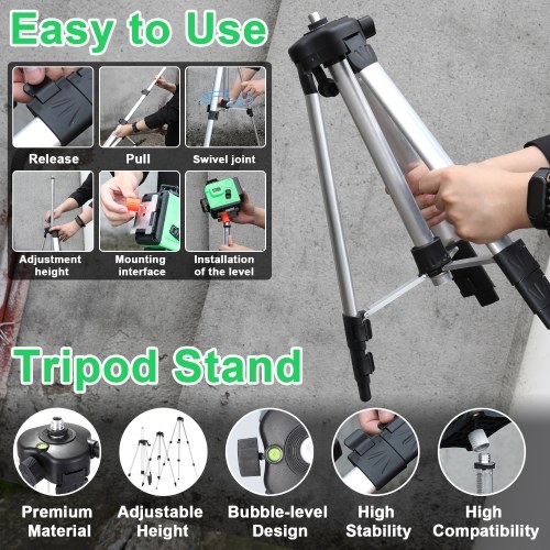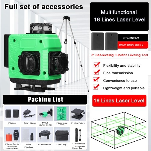 The laser level meter can emit 16 visible lase horizontal, vertical and oblique lines for the automatic leveling separately or simultaneously. Equipped with self-test calibration function, ≤3° automatic leveling, but if the angle is over 3°, the laser light will keep blinking and the laser level will make a beep sound to remind you to reset them on a flat ground. Comes with one tripod bar, which is made of thicken aluminum alloy material, 3-heights adjustable, suitable to most of laser level with 5/8" interface. It provides accurate horizontal and vertical data for indoor construction stakeout and calibration, easy to operate and versatile. Suitable for flooring tile layout, paneling, wallpapering, stenciling, wainscoting, finish carpentry, wall stud layout and partition installation.
