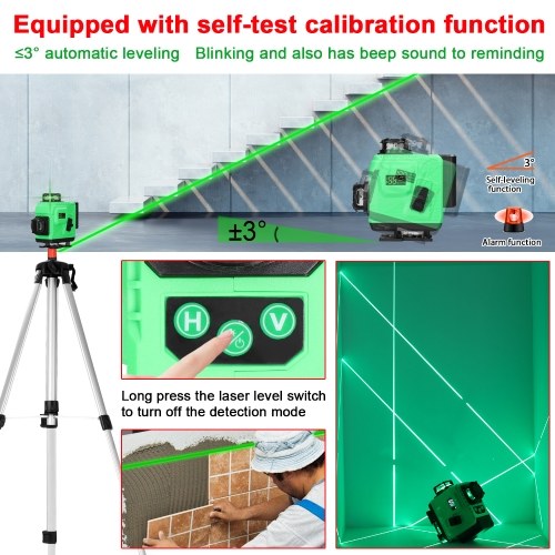 【3° Automatic Leveling】: Equipped with self-test calibration function, ≤3° automatic leveling, but if the angle is over 3°, the laser light will keep flashing and the laser level will make a beep sound to remind you to reset them on a flat surface.