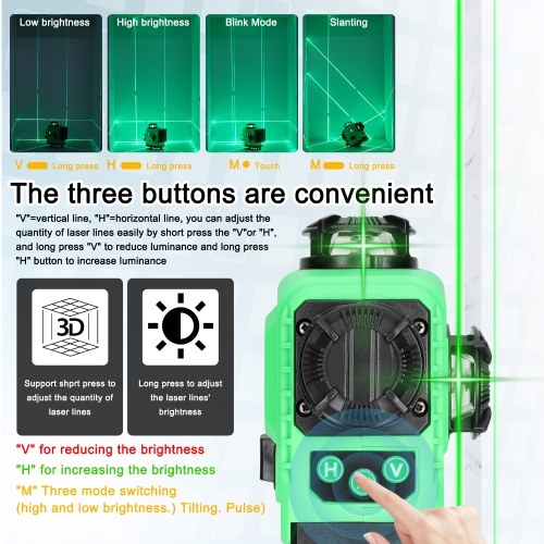 【Laser Quantity & Brightness Adjustable】: The three buttons are convenient for you to control the laser quantity and laser brightness, with high sensitivity line mode switching and line brightness adjustment. Support continuous laser and pulse laser, and also support pulse laser under tilt mode.