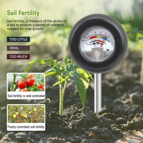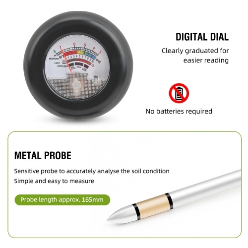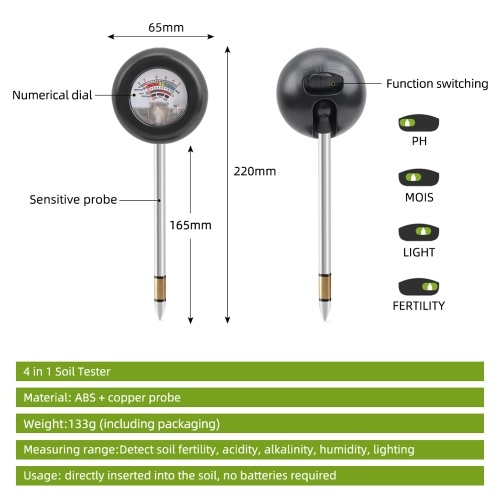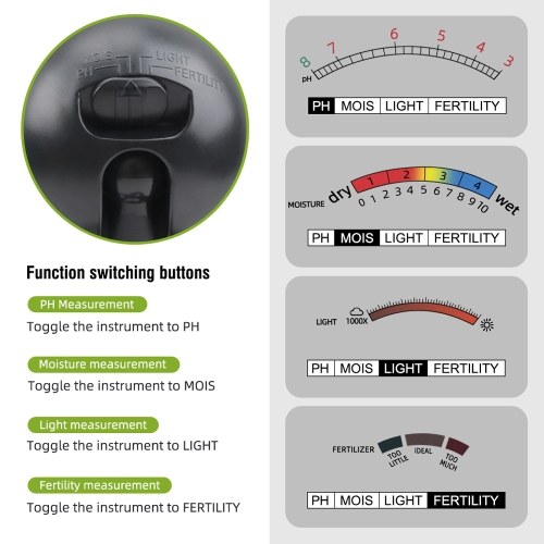 This product is simple to use. Just insert the product to the soil and wait until the display stabilizes to see the moisture/PH/Fertility/Sunlight Intensity of the soil, so that you can improve the soil environment in time and make plants healthier.