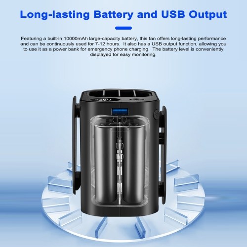 Long-lasting Battery and USB Output: Featuring a built-in 10000mAh large-capacity battery, this fan offers long-lasting performance and can be continuously used for 7-12 hours. It also has a USB output function, allowing you to use it as a power bank for emergency phone charging. The battery level is conveniently displayed for easy monitoring.