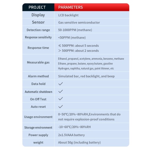 Triple Alarm Assurance: Natural gas leak detector offers a triple alarm system – analog bar, light, sound, and the detection speed can be as fast as 2S. When flammable gas is detected, the gas detector's analog bar will increase and will sound. The sound intensifies with increasing gas levels, and the 1.1-inch LCD turns red for high gas concentrations.