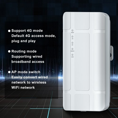 Default 4G access mode, plug and play. Support 4G mode, routing mode, AP mode switch, built-in quick configuration wizard, guide customers to complete the configuration easily. Routing mode, supporting wired broadband access; AP mode, easily convert wired network to wireless WiFi network. Support 4G and wired two kinds of broadband access, support mobile Unicom telecom 4G/3G/2G network card.