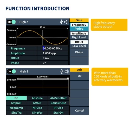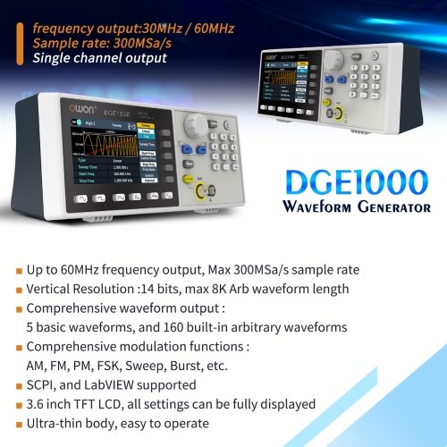 Up to 60MHz frequency output, Max 300MSa/s sample rate.