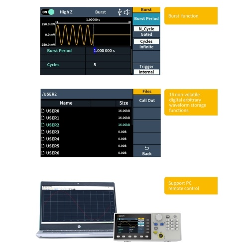 Comprehensive waveform output: 5 basic waveforms, and 160 built-in arbitrary waveforms.
