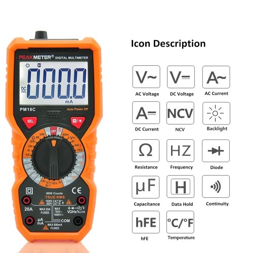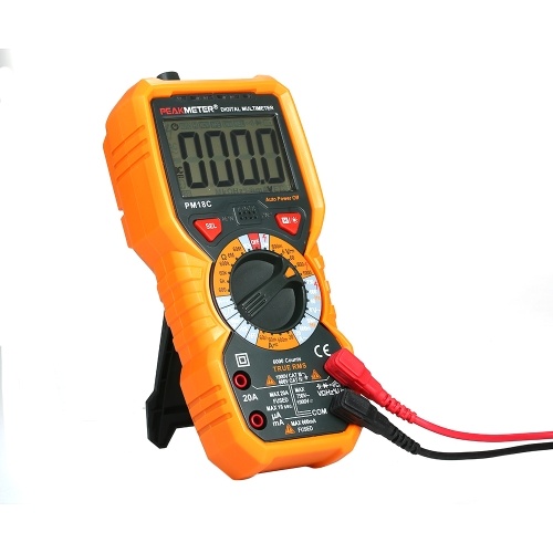 This multifunctional multimeter with high precision and high performance can measure AC/DC voltage, current, resistance, capacitance, frequency, duty ratio. It also can test NCV(non-contact voltage), live line, diode, transistor and continuity. With a bracket on the back, convenient to place it on the table and read the values.