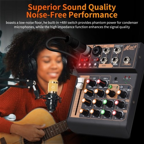 【Multi-Purpose Applications】: Connect various devices effortlessly and enjoy lossless recording and live mixing. The mixer's 4-channel configuration provides ample inputs for microphone and instrument connections, giving you full control over your audio setup.