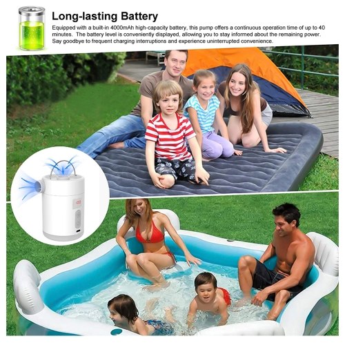 Long-lasting Battery: Equipped with a built-in 4000mAh high-capacity battery, this pump offers a continuous operation time of up to 40 minutes. The battery level is conveniently displayed, allowing you to stay informed about the remaining power. Say goodbye to frequent charging interruptions and experience uninterrupted convenience.