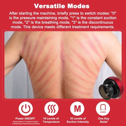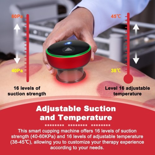 Adjustable Suction and Temperature: This smart cupping machine offers 16 levels of suction strength (40-60KPa) and 16 levels of adjustable temperature (38-45℃), allowing you to customize your therapy experience according to your needs.