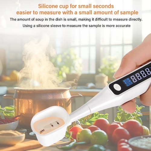 【Convenient and Practical Features】: Includes a reserved hook for easy storage, a silicone cup for accurate measurement of small samples, and simple battery-powered operation, all designed to make everyday cooking and food preparation more convenient and enjoyable.