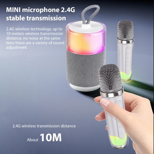 【Wireless Karaoke Experience】 : This BT speaker with dual microphones offers a wireless karaoke experience. With 2.4G wireless technology, it provides up to 10 meters of wireless transmission distance. It's not just a karaoke speaker, but also a standalone BT speaker, offering a seamless connection within 10 meters without any lag.