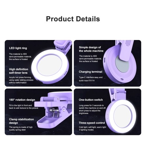 【Built-in Rechargeable Battery】With a built-in 200mAh battery, this portable phone selfie fill light supports long working time and can be easily recharged via Type-C interface, making it convenient for on-the-go use. Say goodbye to disposable batteries!