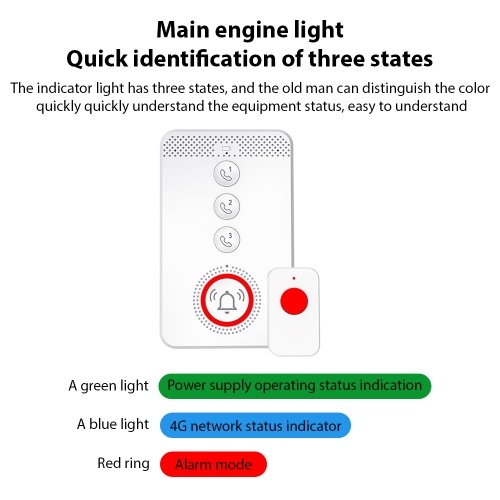 【Wireless Caregiver Pager】: Our main unit features three indicator lights, each representing a different status. Seniors can easily understand the device's condition by recognizing the colors - a green light indicates the power is on, a blue light shows the 4G network connection, and a red light ring signifies an active alarm or distress call.