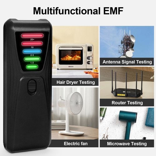 The EMF Meter is a user-friendly device designed to measure magnetic field strength. It can be used both indoors and outdoors to measure electronic devices or power lines. There are 5 indicator lights, each with a different color. These colors represent different field strengths that can help you easily read test results and quickly determine the safety status of the magnetic field. Suitable for detecting high, medium, and low-frequency electromagnetic radiation, magnetic field strength, and sensitivity. It can be used for computers, TVs, hair dryers, vacuum cleaners, antenna signals, routers, electric fans, microwaves, and other electrical appliances.