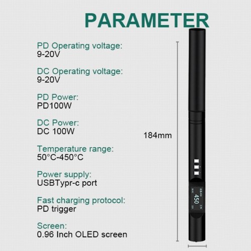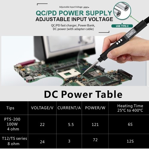 【Multiple Power Supplying Methods】: Type-C interface design, the 5/12/20V power source and charging pal can be used as the power supplies, with a maximum output power of 100W, and a temperature of 100-450℃ can be controlled.