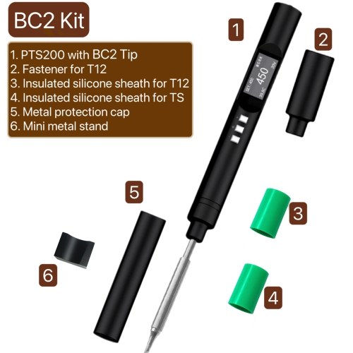 The PTS200 intelligent soldering iron is powered by a 5/12/20V power source or charging pal with a maximum output of 100W and a controllable temperature of 100-450℃ via the Type-C connector. The housing is made of aluminum alloy material and fixed with high-precise threads without screws. The structure is compact, ergonomic, and quite technological. A total of 3 types of soldering iron tips are available (BC2, K, I), you can choose according to your usage needs. With vibrating sensing and auto sleep function. Support Chinese and English switching and USB upgrade firmware.