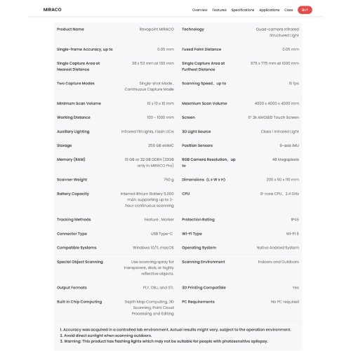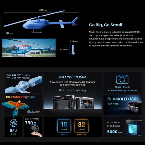Stunning Accuracy and Color: Create richly detailed with photorealistic textures 3D models ready for 3D modeling with MIRACO's single-frame accuracy of up to 0.05 mm and powerful 48-megapixel RGB Camera.