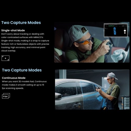 2 Capture Modes: Single-shot mode makes it a snap to capture feature-rich or featureless objects with precise tracking, high accuracy, and minimal point cloud overlap. Create 3D models fast using Continuous mode's fast up to 15 fps scanning speeds.