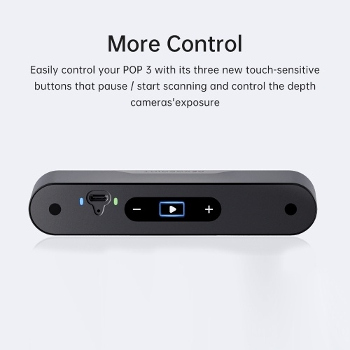 User-Friendly: Designed with ease of use in mind, the POP 3 scanner ensures a smooth scanning experience. The addition of three touch-sensitive buttons allows you to effortlessly start/pause scans and adjust the depth camera's exposure on the fly for precise control over your scan.