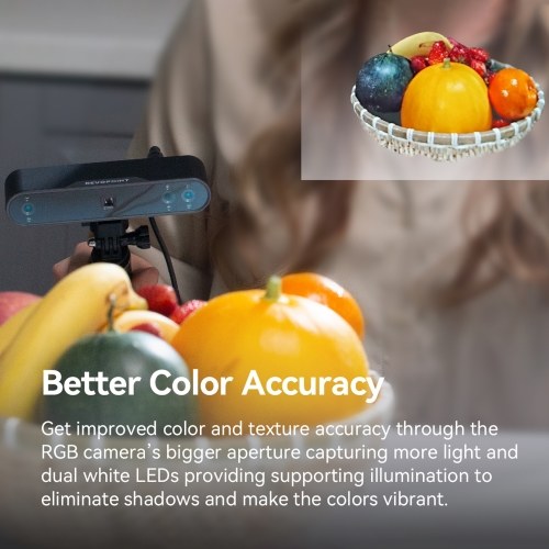 High Fidelity Color Scans: Immerse yourself in vibrant, lifelike 3D scans with the POP 3's enhanced color scanning capabilities. The RGB camera’s 20% larger aperture lets more light reach the sensor, and dual white LEDs illuminate and remove shadows from the scanned object. So POP 3 can capture more vivid and realistic full-color 3D scans.