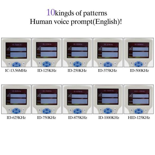 Full frequency band, with voice broadcast function. (125KHz, 250KHz, 375KHz, 500KHz, 625KHz, 750KHz, 875KHz, 1000KHz, 13.56MHz, HID-125KHz)