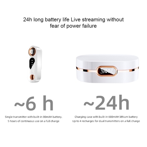 【Long-lasting Battery Life】: Don't worry about running out of power during important recordings or performances. The microphone's built-in 70mAh battery provides up to 5 hours of continuous use, while the 600mAh charging compartment battery allows for convenient charging on the go. With a quick charging time of approximately 2 hours, you'll be back up and running in no time.