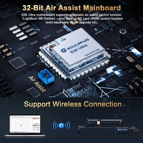 Upgraded 32-bit air-assisted motherboard: the latest 32-bit motherboard supports automatic air-assisted control function, supports wireless BT connection to control the machine, and is not limited by the distance of the USB cable.