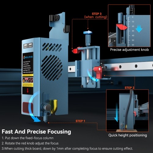 4. Precise Focusing Design: Designed with a most precise focusing, the focus lever on the laser head is stable that enables the focusing position more accurate. The red knob on the right side of the laser is to raise or lower the laser module for the quick height positioning according to the material's thickness, and the rotary knob on the top of the laser is for the precise adjustment.