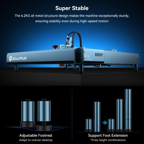 6. Adjustable Machine Height: The Sculpfun SF-A9 comes with the additional metal support pillars that can adjust the height of the machine to facilitate the engraving of higher objects, meeting a variety of working needs.