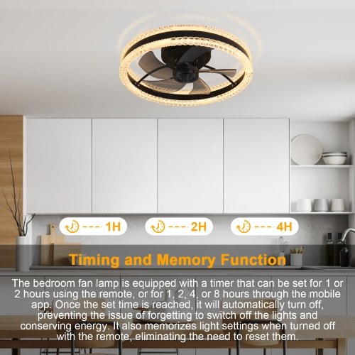 Timing and Memory Function】The bedroom fan lamp is equipped with a timer that can be set for 1 or 2 hours using the remote, or for 1, 2, 4, or 8 hours through the mobile app. Once the set time is reached, it will automatically turn off, preventing the issue of forgetting to switch off the lights and conserving energy. It also memorizes light settings when turned off with the remote, eliminating the need to reset them.