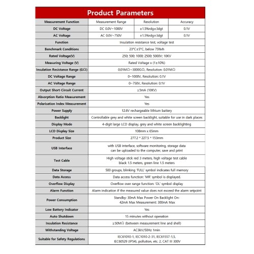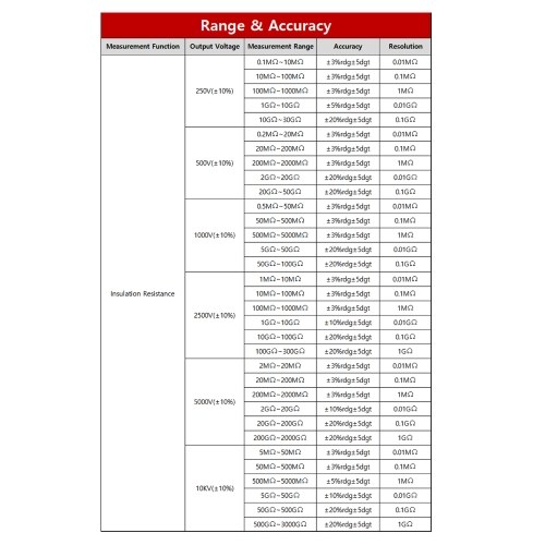 Insulation Resistance Range (GΩ): 0.01MΩ~3000GΩ, Resolution: 0.01MΩ