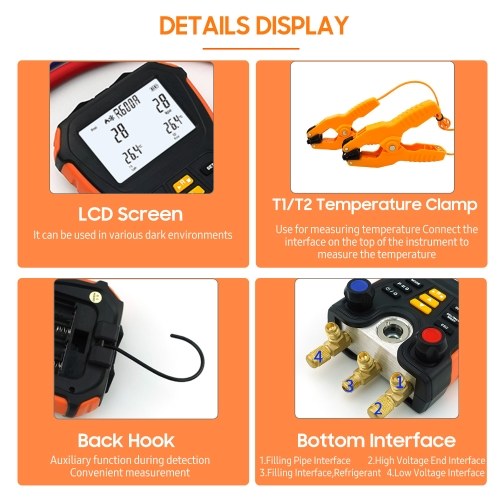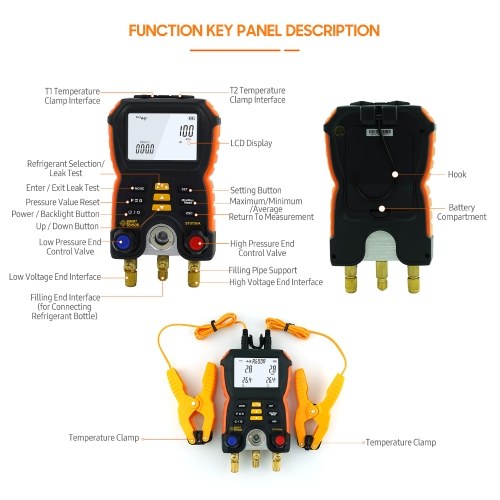 This product is the integration of functions of pressure measurement and temperature measurement. It is mainly used for leakage detection, refrigerant charging, troubleshooting and maintenance of the refrigeration system.