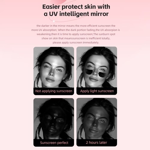 UV Intelligent Detection Mirror: The darker you face in the mirror means the more efficient sunscreen and the more UV absorption. When the dark portion fading, the UV absorption is weakening, then it is time to apply sunscreen
