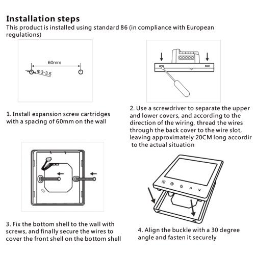 【Sleek Touchcontrol Panel】: Featuring a full-touch control panel, this room thermostat provides a modern and user-friendly interface for easy operation. The clear display shows the current temperature and allows intuitive adjustment with just a few touches.