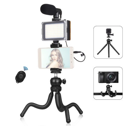 【4-in-1 Video Kit】The smartphone vlog kit is made up of a flexible tripod stand, a cardioid microphone, an extendable phone clip and a mini LED video light, which allows much more convenience for you.