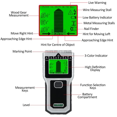2 Extra Functions: There is a 5cm long ruler on the top of the stud finder, which is convenient for customers to mark the center point and need to make additional marks next to the center point. Another is level function which is convenient for customers to use the level to observe whether it is balanced when placing objects after punching holes.