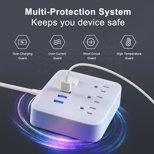 Turn 1 socket into 3 outlets and 3 USB, which could charge 6 devices at the same time. Such a perfect charging station must be the best choice for your office accessories. This power strip has overload, short-circuit, over-current, and overheating guard. The surge protector with an overload guard protects your electrical appliances from damage. Supporting a wide scope of voltage inputs (100V), our power strip is designed to work seamlessly in different countries, making it the ultimate travel partner for global adventurers and remote workers on the go.