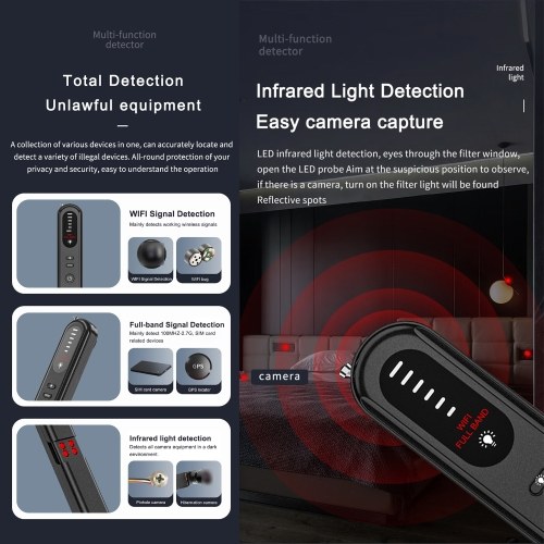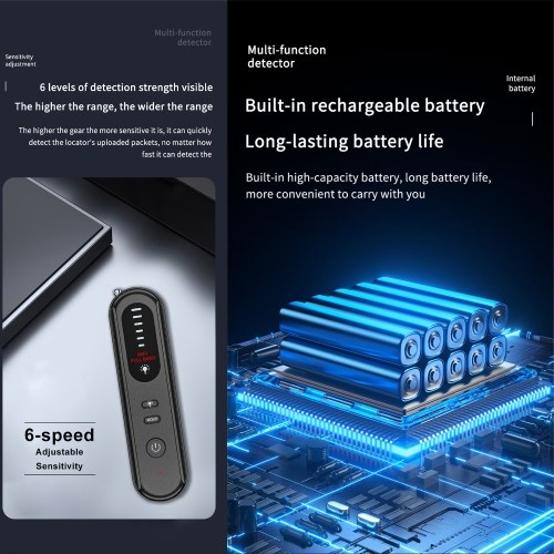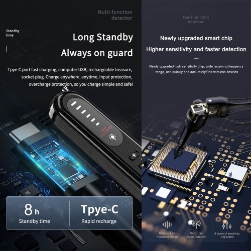 You can trust this device to safeguard your secrecy in any setting. Discover hidden pinhole cameras with direct visual inspection with infrared scanning. Detect active radio frequency transmitters, such as transmission cameras, GPS trackers, and wireless audio. Rechargeable battery design and can be used for about 8 hours after full charging. This bug and hidden camera detector could also be used in any place you don't trust, making it a must-have when you are out and about.