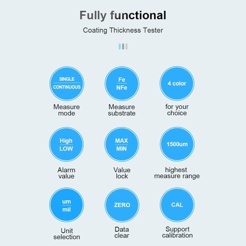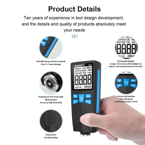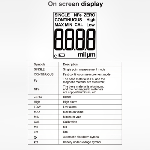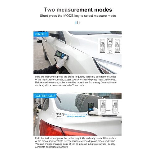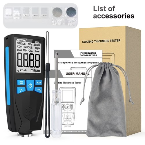 This coating thickness tester has LCD display with backlight, easy to read values. Two measurement modes design, with single point measurement mode and continuous measurement mode for you to adjust. Support upper and lower Limit value locking, custom calibration, high alarm and low alarm function, data clearing, μm/mil unit conversion, automatic switch-off for approx. 10 minutes without operation. Support detect steel, iron, copper, aluminium, alloys, etc. And also can detect the thickness of non-conductive coating (such as paint, oxide film, plastics, ceramic) on the surface of metal materials.