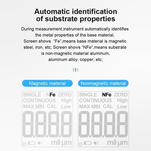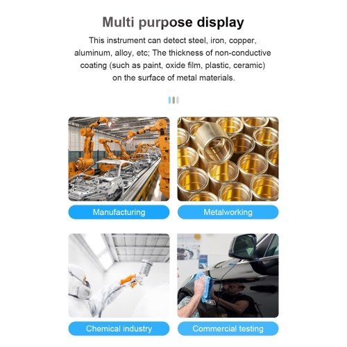 Applicable Materials: This instrument is a necessary measurement tool for material surface treatments projects, and can detect steel, iron, copper, aluminium, alloys, etc. And also can detect the thickness of non-conductive coating (such as paint, oxide film, plastics, ceramic) on the surface of metal materials.