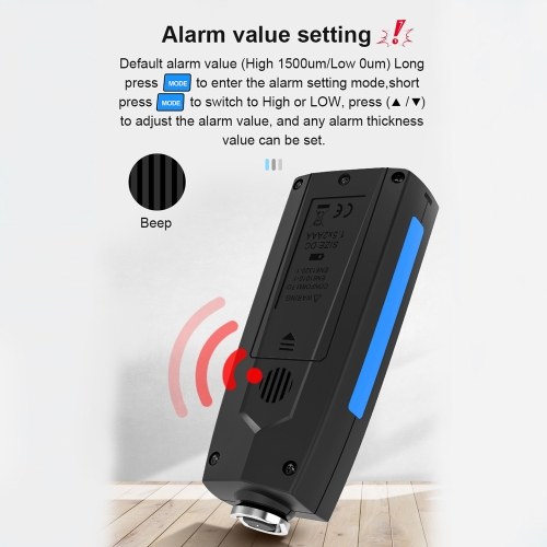 Alarm Function: With high alarm and low alarm function, high 1500μm, low 0μm default alarm value, support alarm setting mode, easy to adjust the alarm value size, can set any alarm thickness value.
